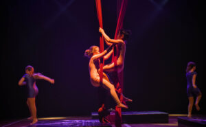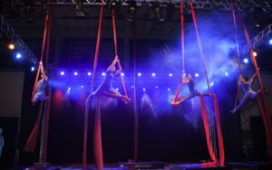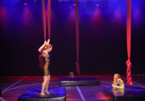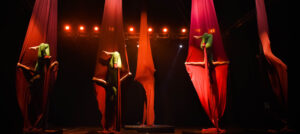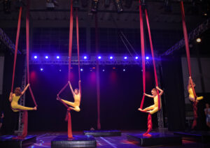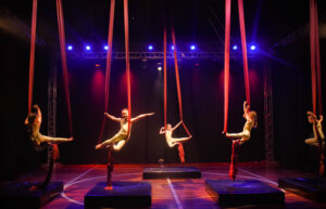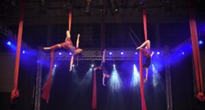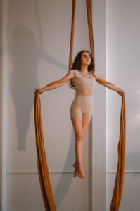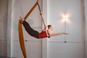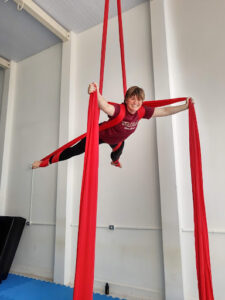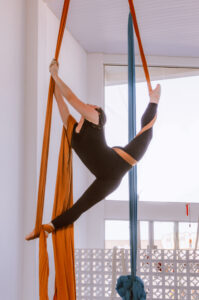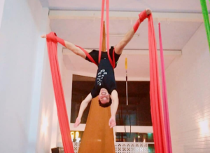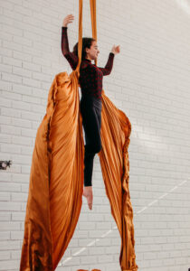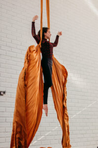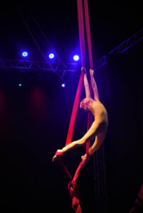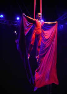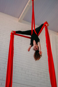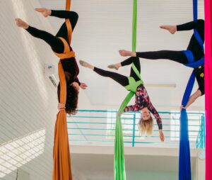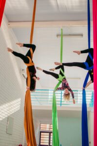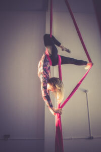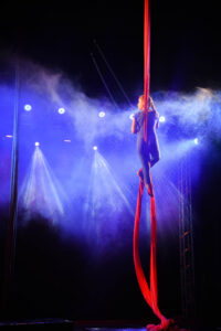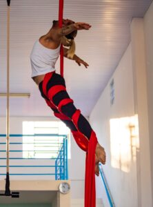 Aproveite nossas aulas de Tecido Acrobático, Trapézio, Lira, Corda Lisa e Faixas aéreas.